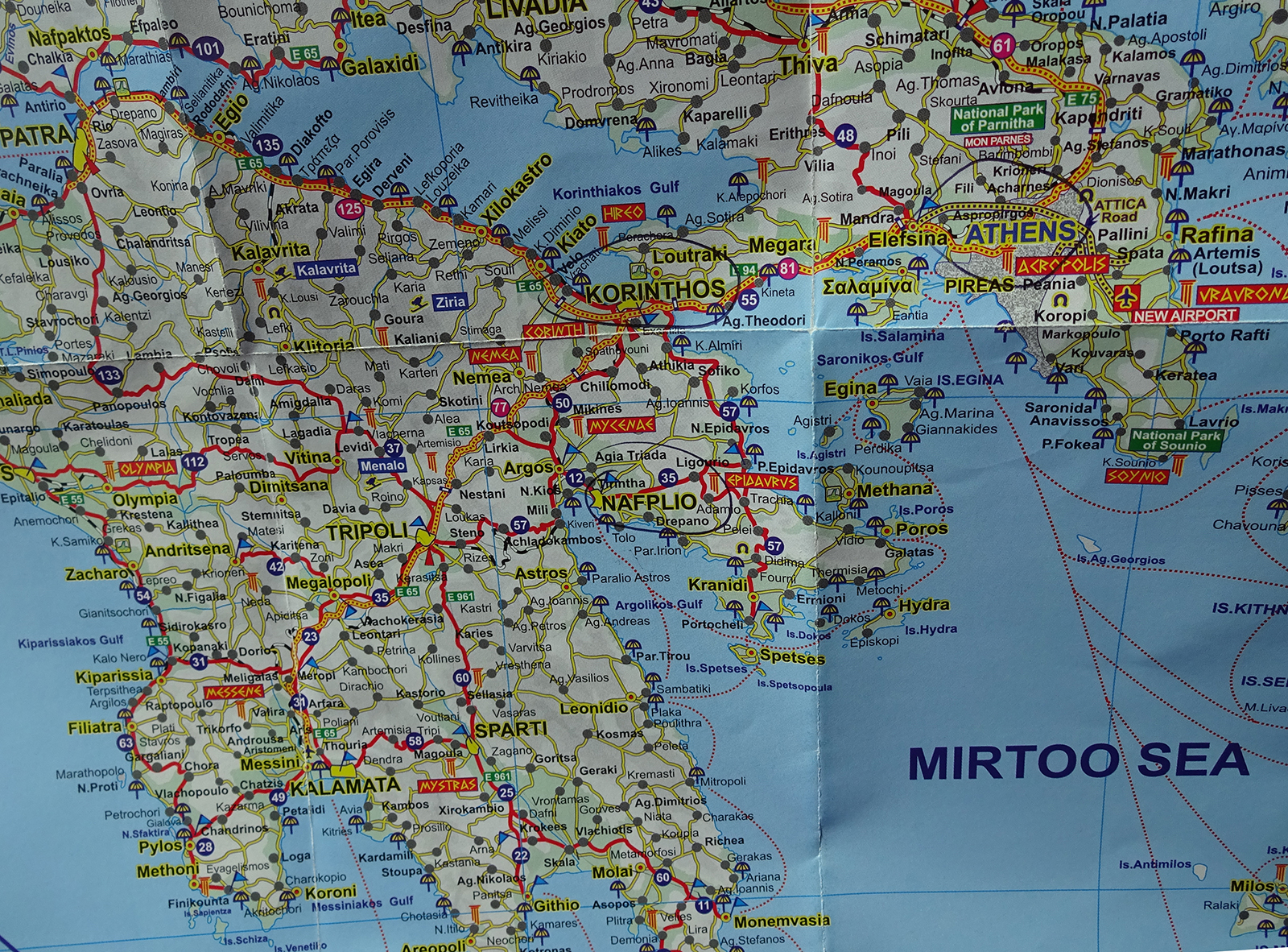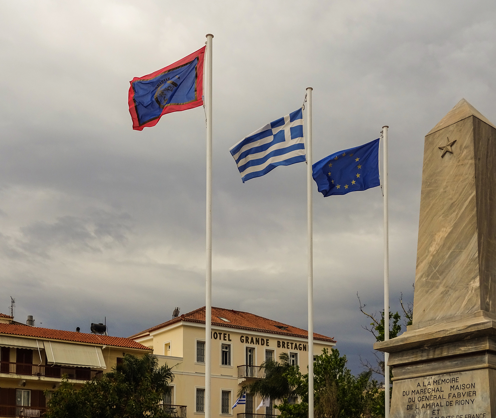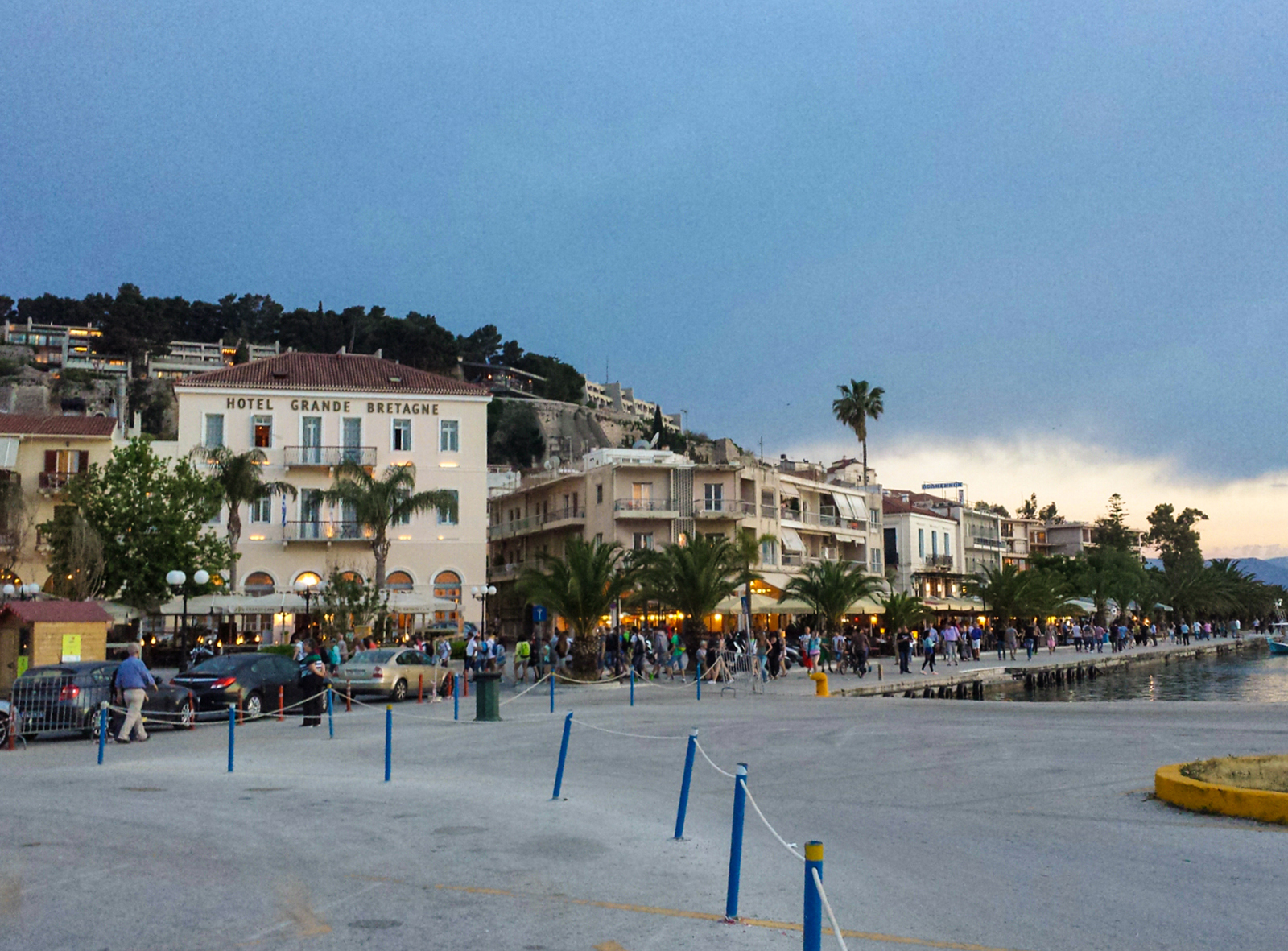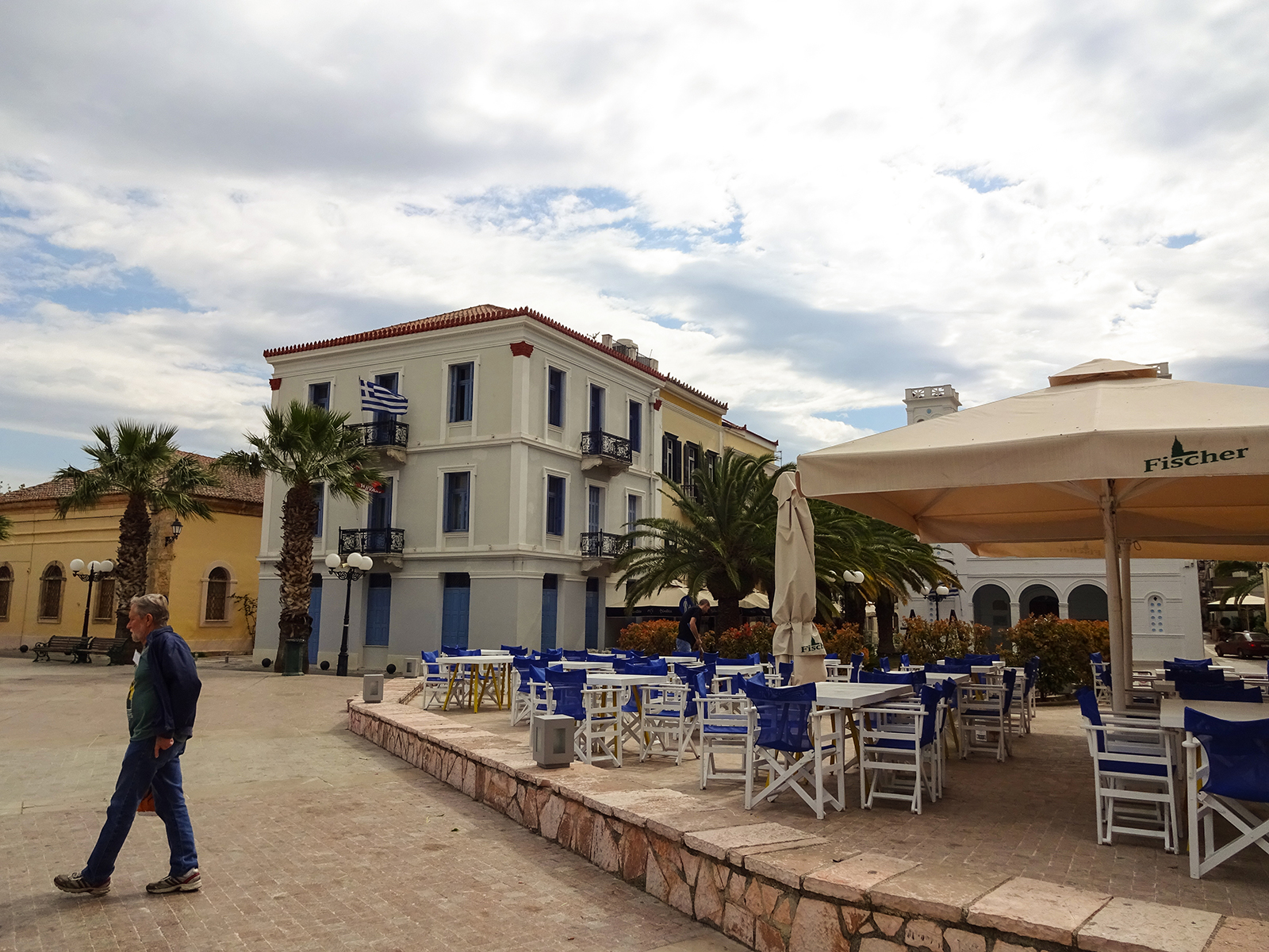 The next morning, Sunday, it is drizzly and dreary, but we are up, well breakfasted, and ready to explore Nafplio in the daylight by 9:30. The shops don’t open until 10 at the earliest, so we wander, taking pictures of the odd shrine or balcony over the narrow streets. I am enchanted to hear Greek Orthodox chanting coming from somewhere directly behind a little shrine. When the shops finally open we do our best to assist the Greek economy, haggling over shirts, jewelry, and souvenirs.