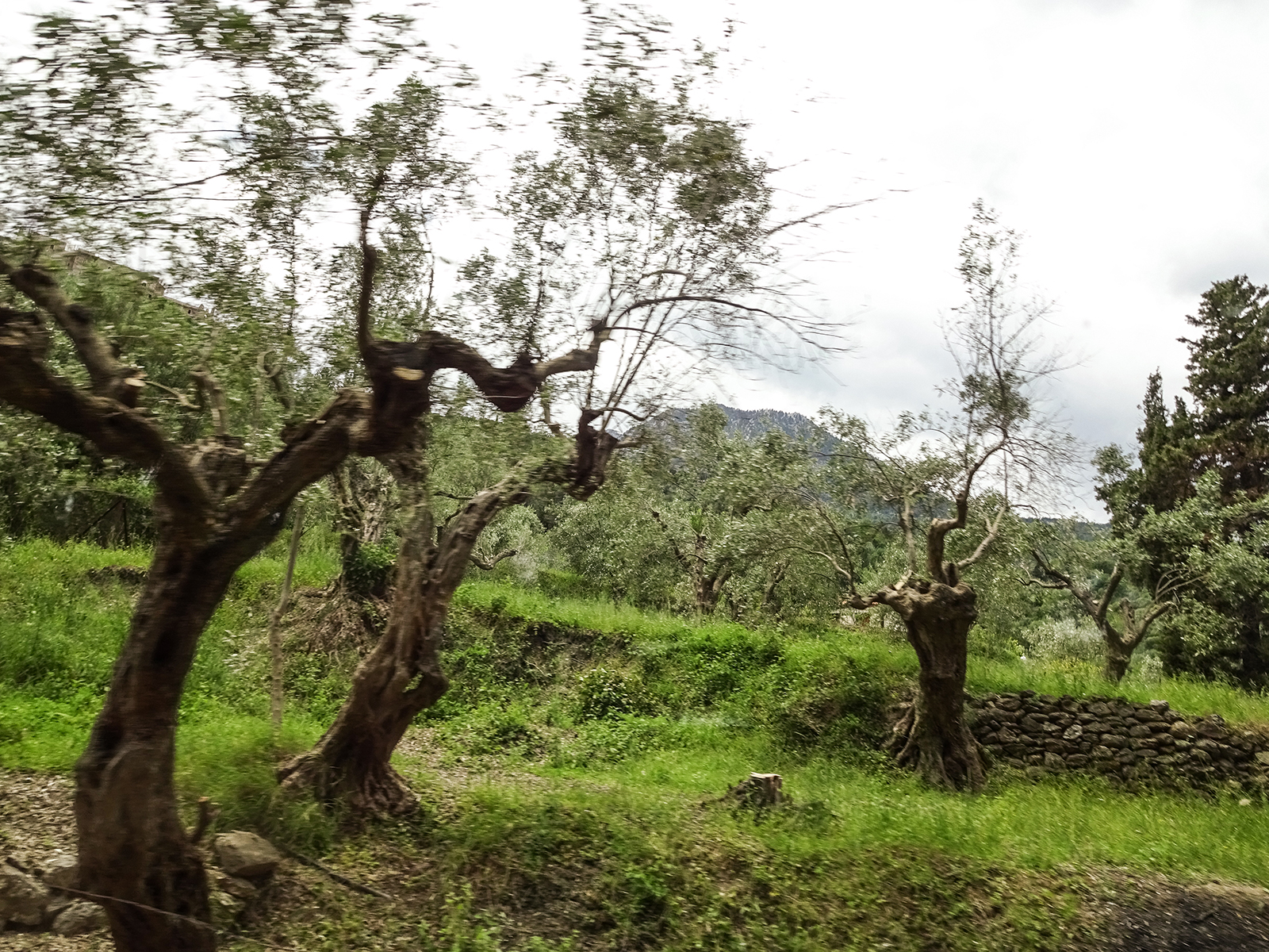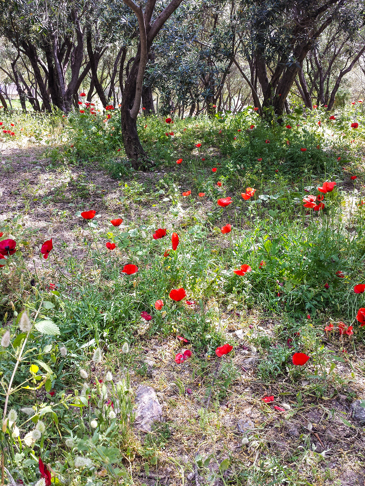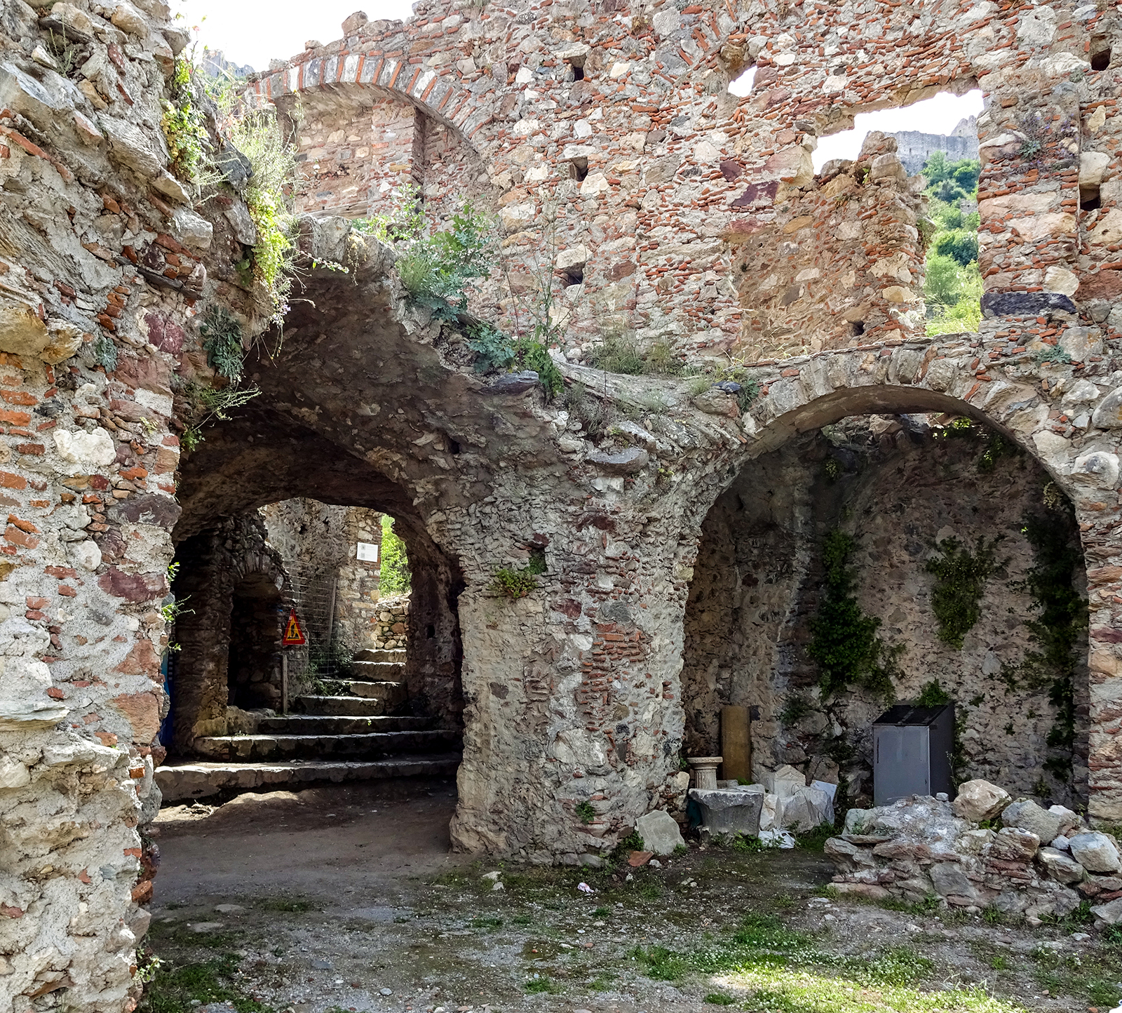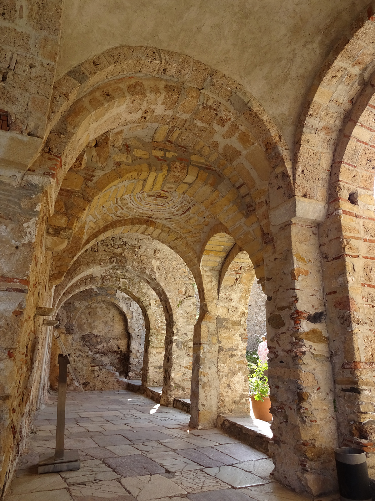 After leaving Nafplio, we head southwest to Sparta (not knowing this of course), past orange groves in full bloom (oh the smell!) and pistachio groves, for which the region is famous. Some of us managed to get hold of maps and follow road signs, and then we tried to guess where we were going. Kalamata? Sparta? No, we just passed through Sparta . . . and headed uphill to have an alfresco lunch in a small hillside restaurant under an awning, overlooking Sparta. After lunch we climbed just a bit higher and disembarked the bus outside the hilltop fortress of Mistra, where there are several old Byzentine churches, one of them still operating every Sunday, tended by nuns and a visiting priest. We were sure we could hike up to the top, to the castle fortress, but we were wrong. Although it always seemed to be just around the next bend, it never actually got any CLOSER!