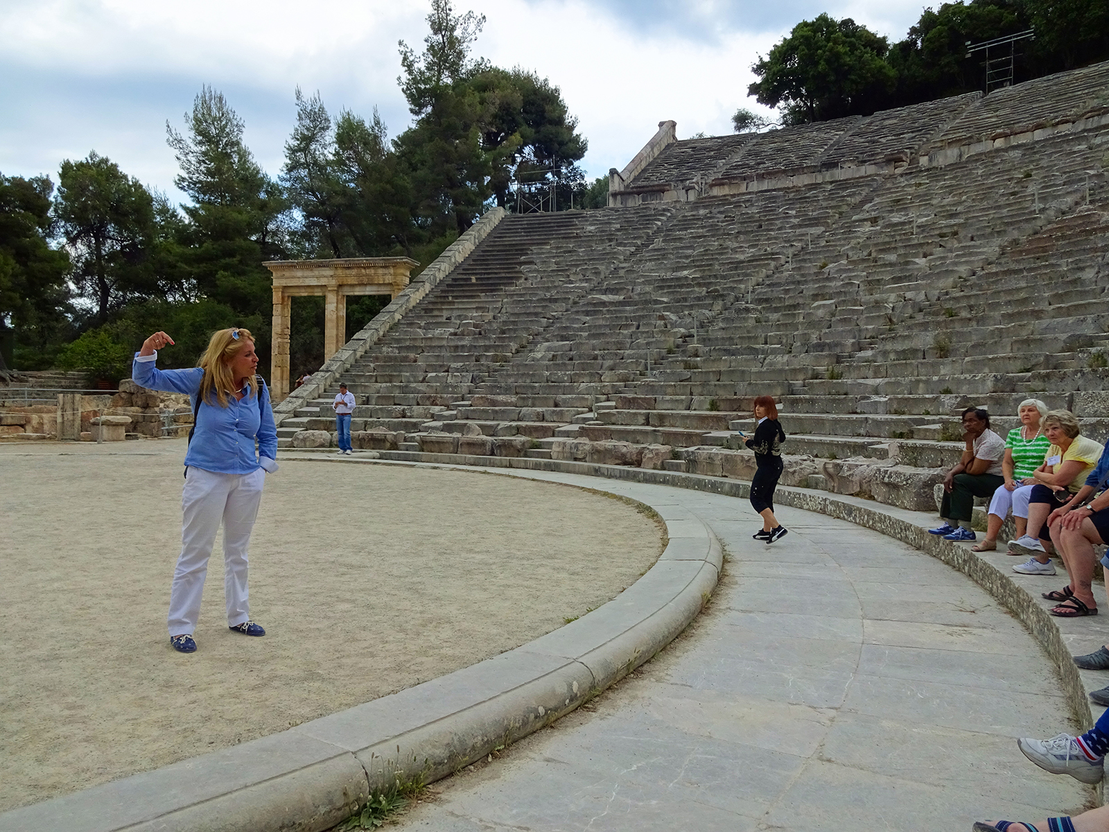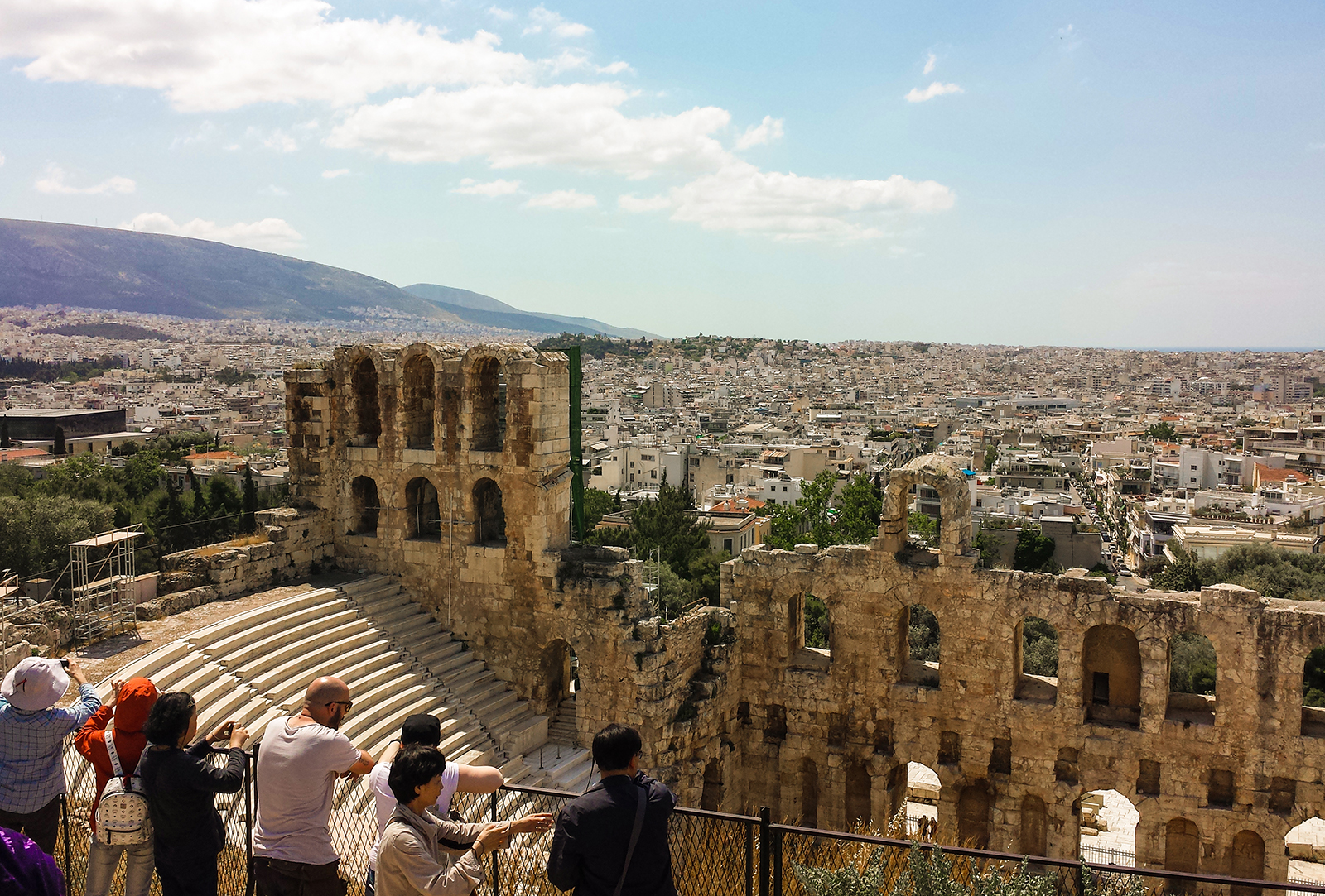 Right. No rest. Right from the plane to a bus, our luggage stowed in compartments beneath us, and then out of the bus to climb the hill to the Athens Acropolis and a wonderful view of the city. Then back down for a hasty lunch on our own across from the Acropolis Museum, then a tour of the museum (do not miss this if you’re in Athens – it’s exquisite!), and then, finally, to our lovely hotel.