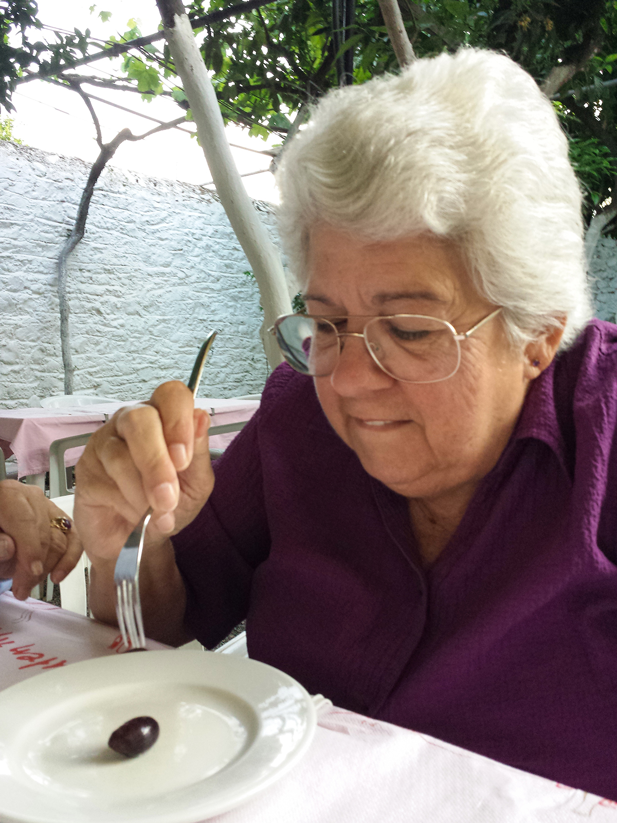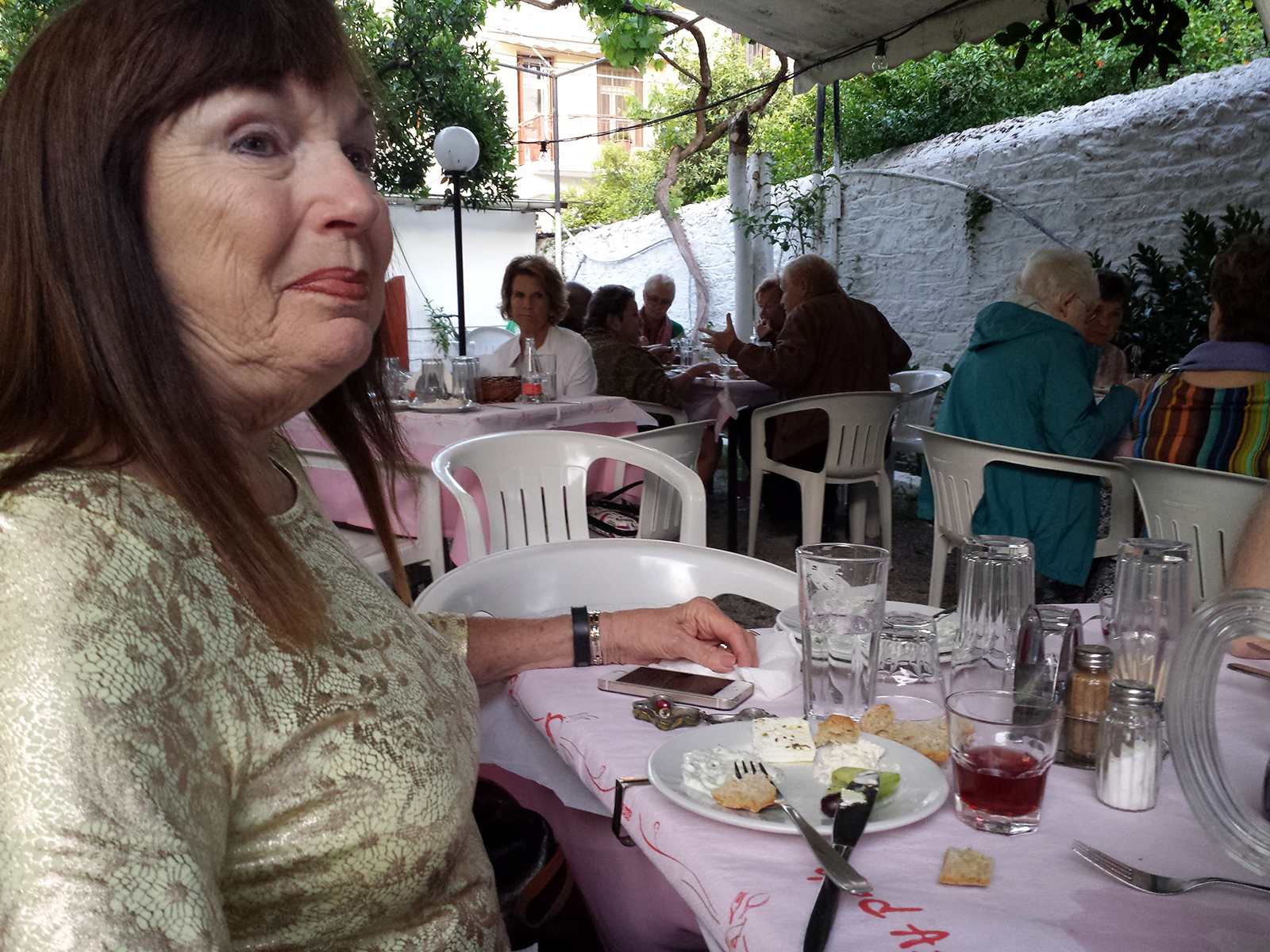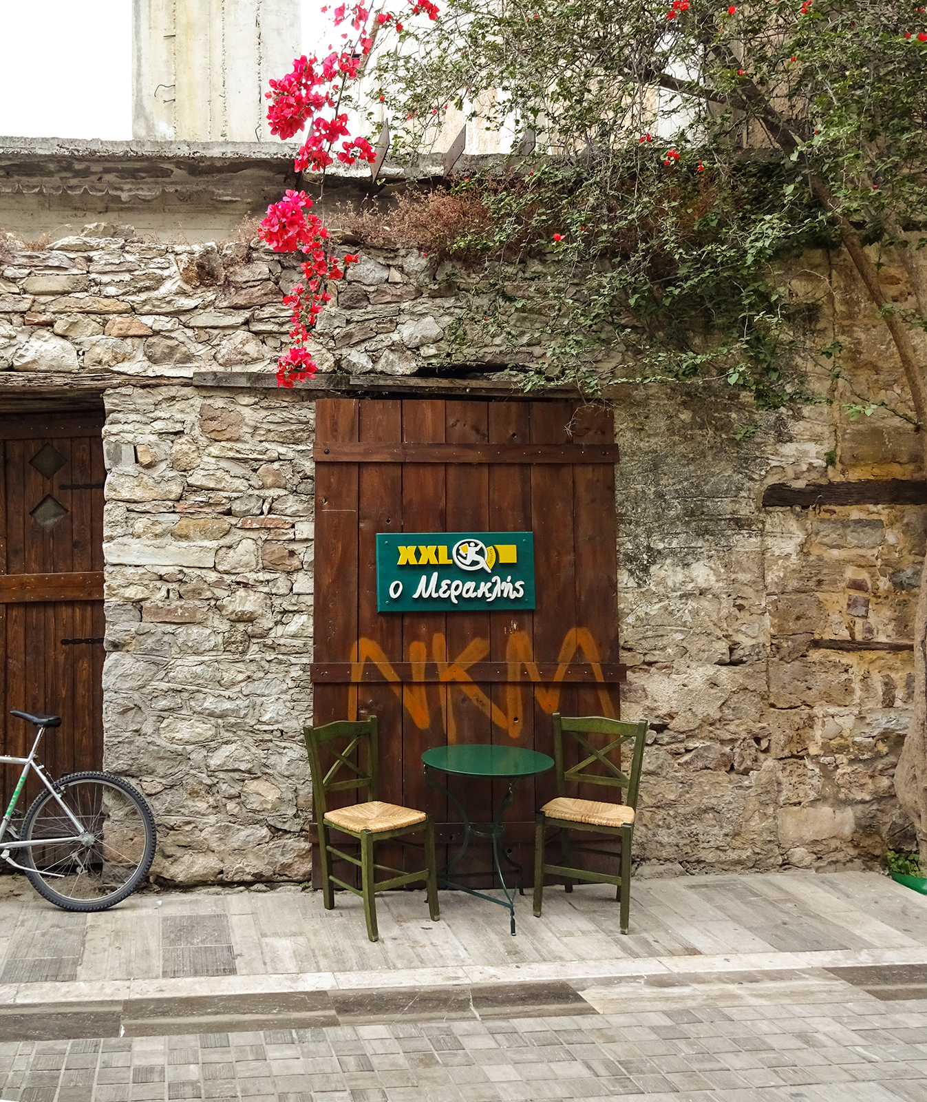 We decide to scrap another museum tour and instead we stop at Aeropolis, where Eva knows a good bakery. She tells us this part of Greece, and particularly this town, was inhabited by pirates, and the people here tend to be somewhat secretive and keep to themselves. However they seem friendly enough to us. And what a wonderful town! Completely undiscovered by tourists of any kind, and yes, the bakery was wonderful. We ate cheese pies while walking around, inspecting flowers, stone buildings, picturesque doorways, local gathering spots, and local produce. I bought an excellent orange, so big it lasted me well into the morning.