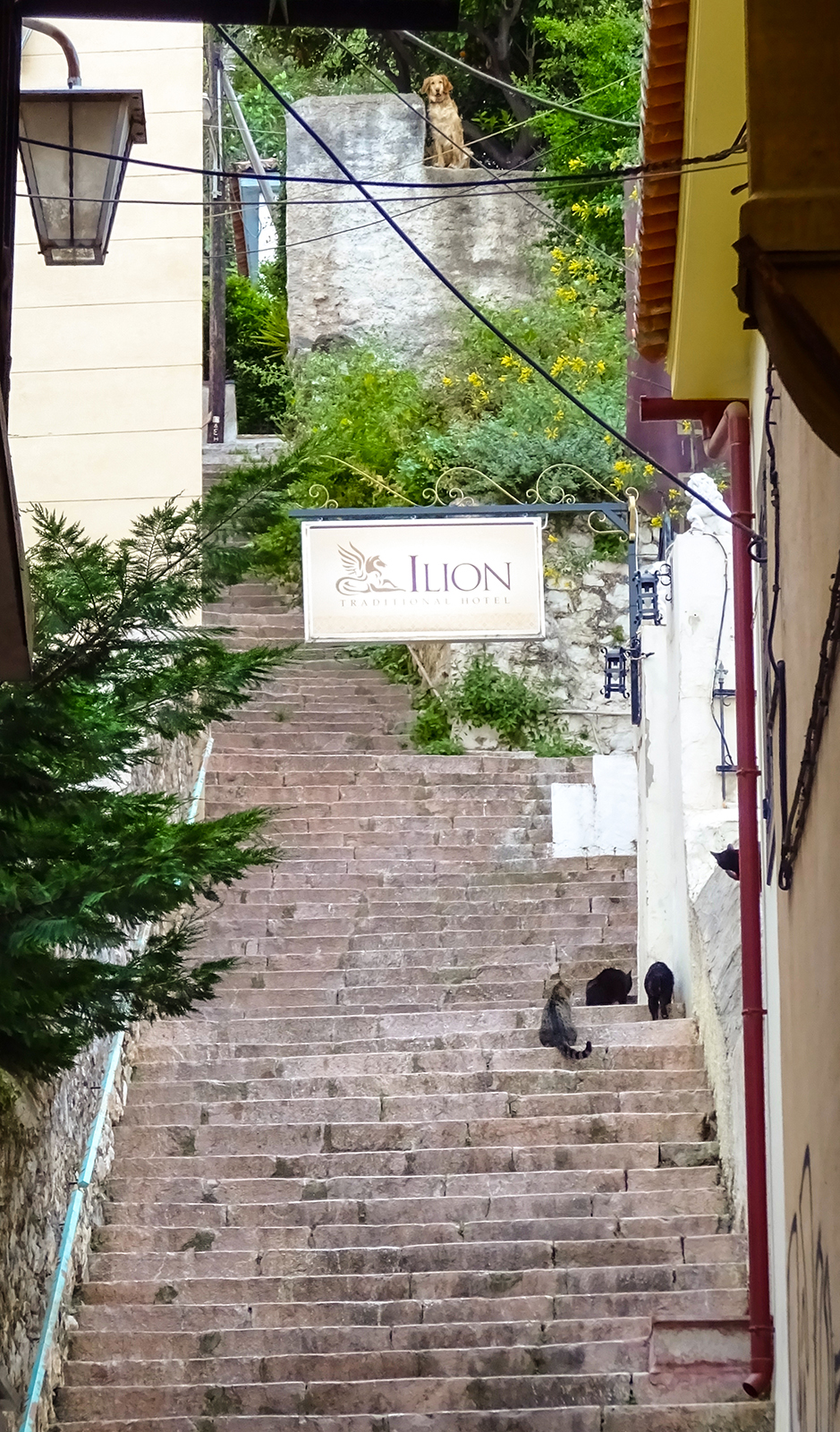 Our legs shaking, we got back in our bus and headed back to Sparta for dinner in an outdoor courtyard (where we gave a significant portion of dinner to the local feral cats) – and our hotel.