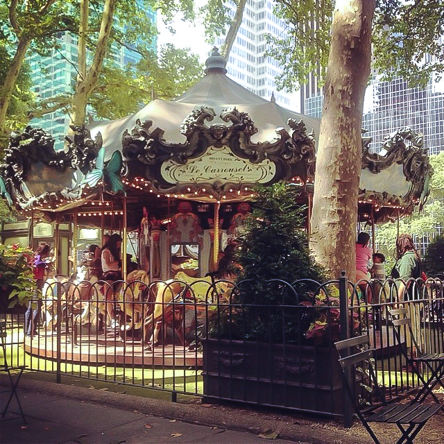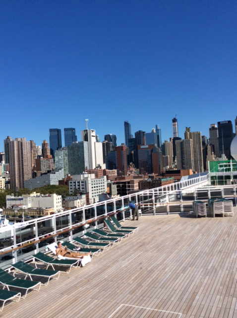 Went into Manhattan this afternoon, walked around Times Square and over to Bryant Park (They have the neatest carrousel, with a wooden cat figure–so of course, I rode it –thus encouraged,other adults also rode–I’m a troublemaker).Met an English couple ( his wife rode), they are also going on the QM. Dinner was Indian food delivered to my room–good chicken korma–too tired to go out. Tomorrow, the ship.J